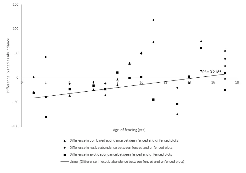 Figure 7. Difference in native, exotic and combined species abundances between fenced and unfenced plots with fencing age